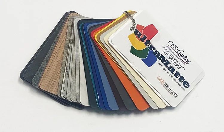 “No fingerprints or smudges land on the surface of this silky smooth finished laminate with choices of solid colors and contemporary patterns. This UltraMatte finish is smudge and stain resistant.”