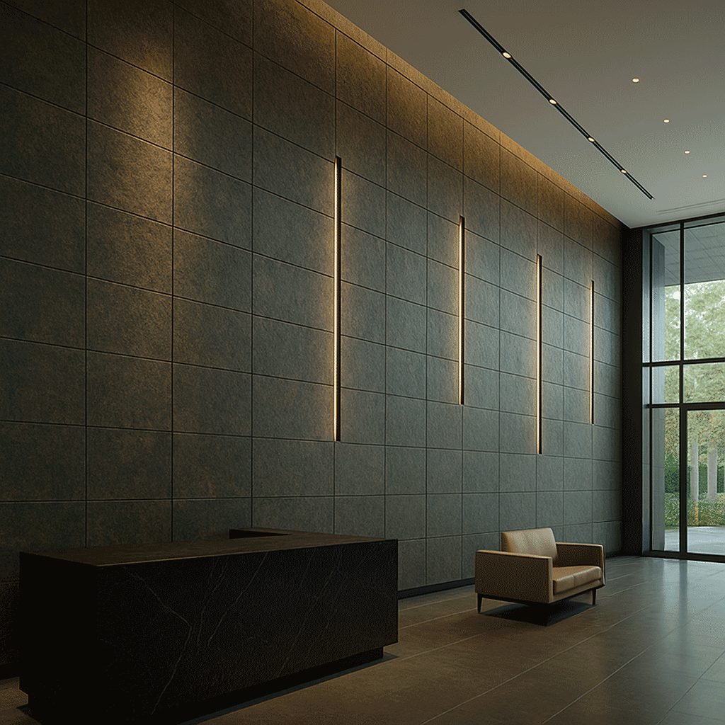 Envision ambient backlit bars shimmering with Lumina, or a sweeping curved stone wall anchoring a modern lobby.
